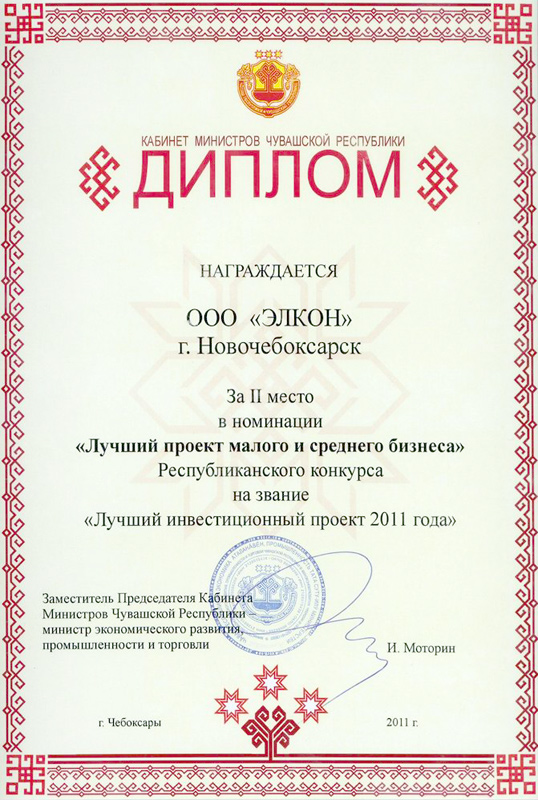 8 (495) 565-38-27В рамках XVIII Межрегиональной выставки «Регионы — сотрудничество без границ» состоялась церемония награждения победителей конкурса инвестиционных программ и проектов. В номинации «Лучший проект малого и среднего бизнеса» ООО «Элкон» заняло II место, за проект — «Организация серийного производства кремнийорганических составов для защиты древесины»