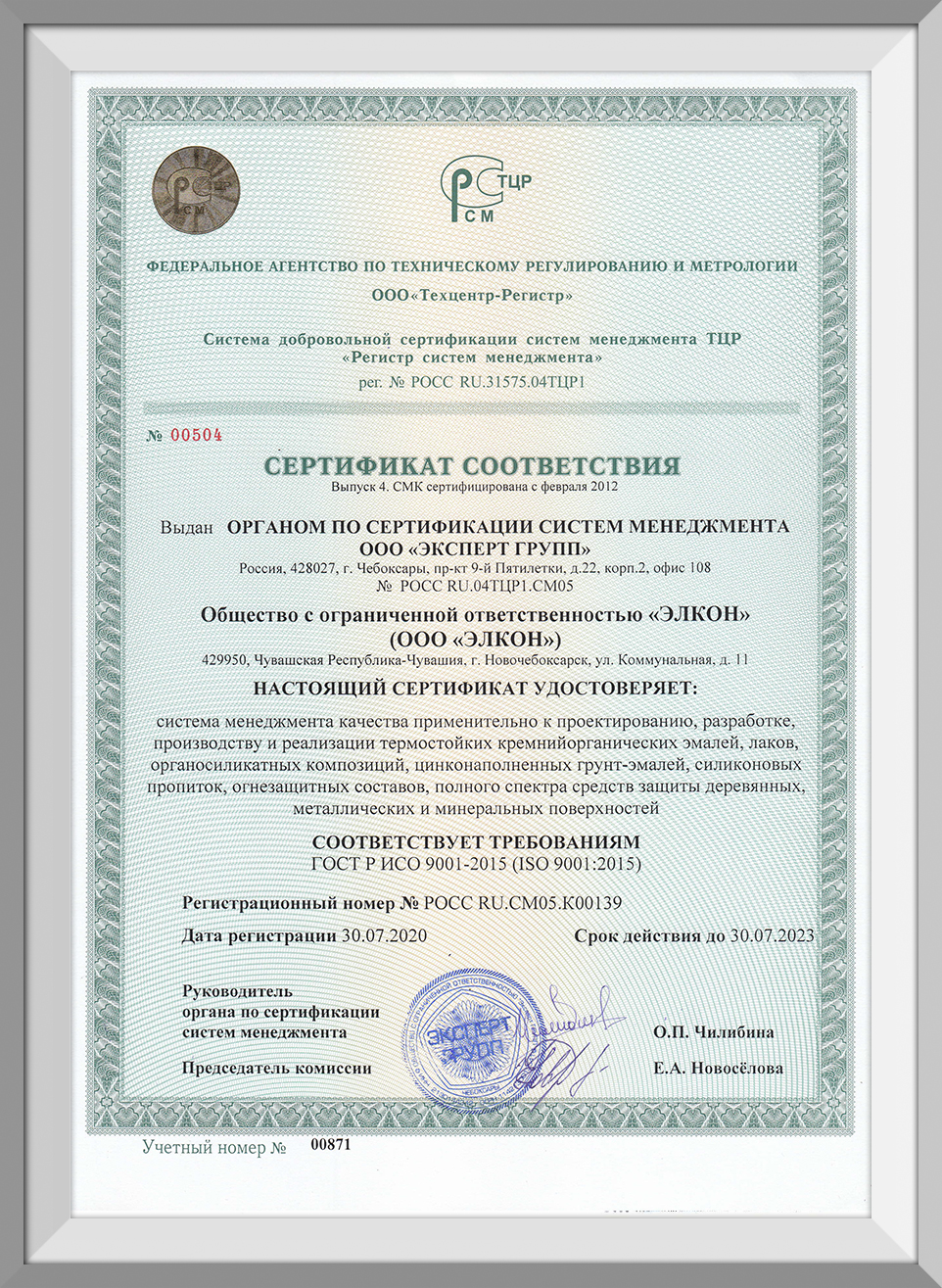 8 (495) 565-38-2730 июля 2020 г. система менеджмента качества ООО «Элкон» применительно к проектированию, разработке, производству и реализации термостойких кремнийорганических эмалей, лаков, органосиликатных композиций, цинконаполненных грунт-эмалей, силиконовых пропиток, огнезащитных составов, полного спектра средств защиты деревянных, металлических и минеральных поверхностей повторно сертифицирована на соответствие требованиям ISO 9001:2015.