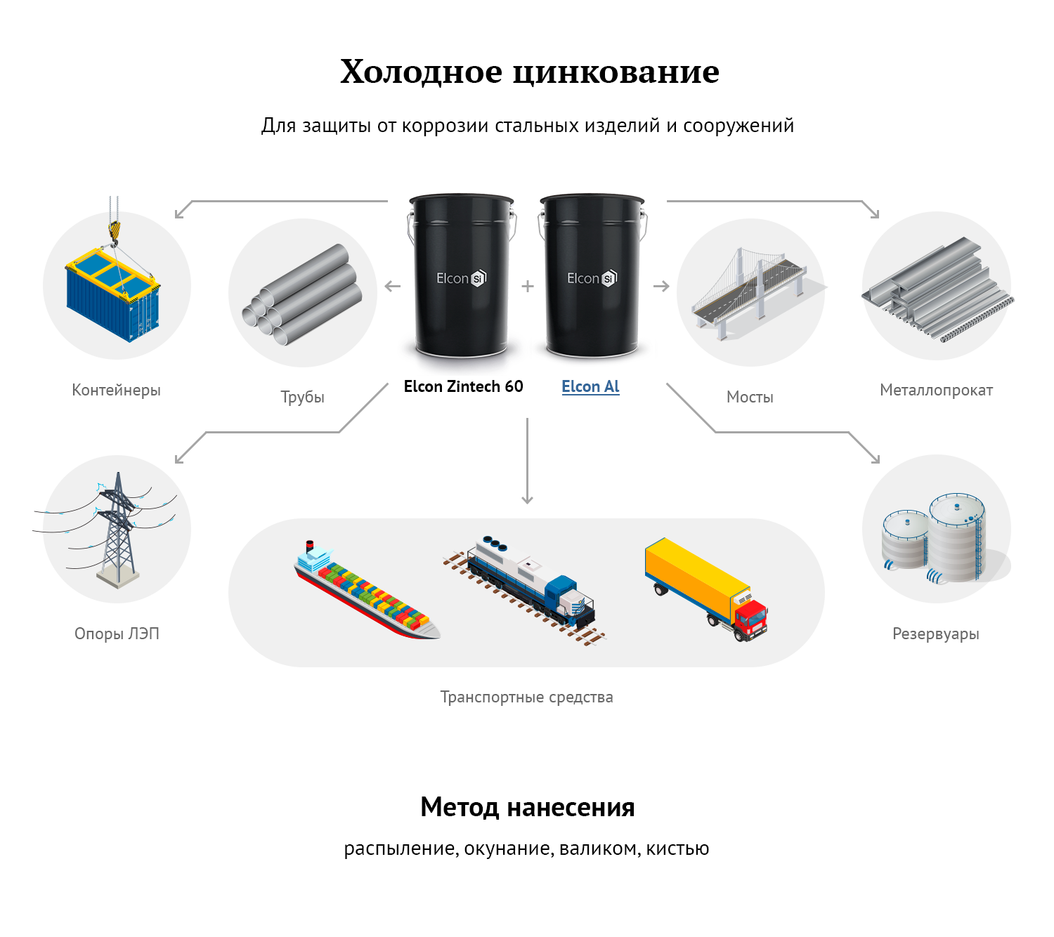 Состав для холодного цинкования применяется в таких областях, как гражданское и промышленное строительство, нефтегазовый комплекс, энергетика, портовые и гидросооружения, широко используется для антикоррозионной защиты наружных и внутренних поверхностей промышленного оборудования, металлических конструкций, дорожных ограждений, опор ЛЭП, заборов, мостовых опор и перекрытий.
